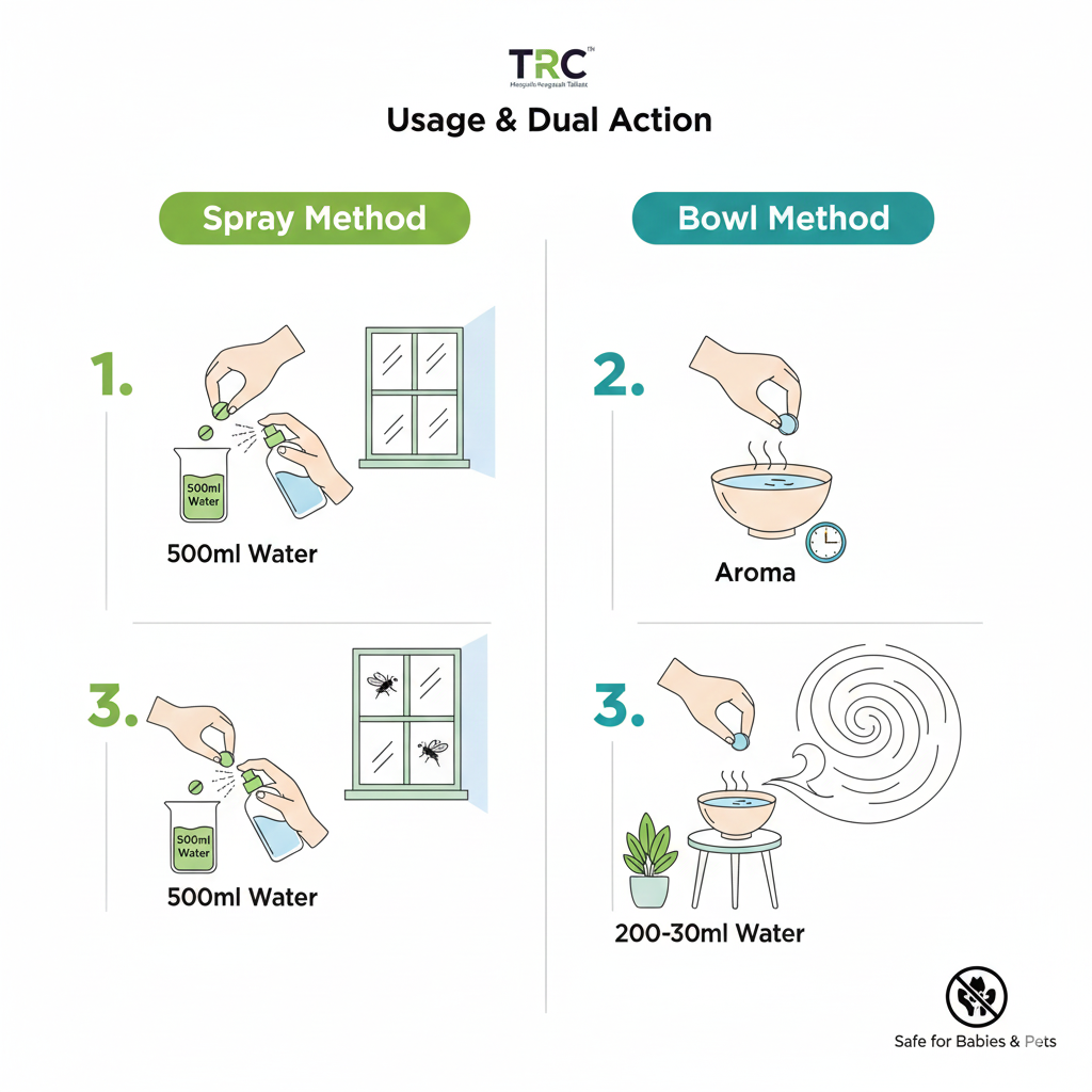 - DUAL APPLICATION METHODS: Spray Method – dissolve 1 tablet in 500 ml water and spray around walls, corners and windows. Bowl Method – dissolve 1 tablet in 200-300 ml water and keep near doors and windows